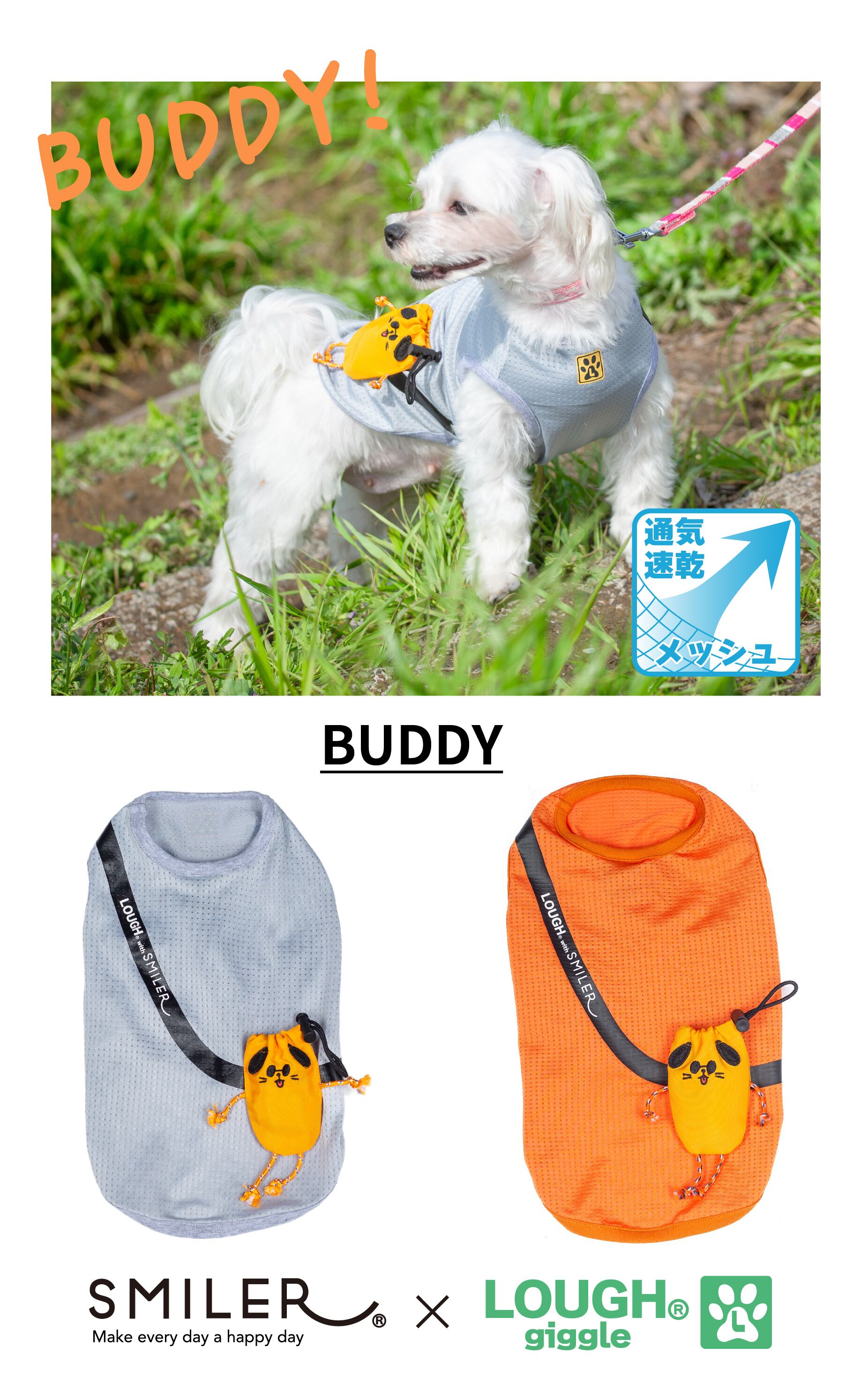別売りの同じBUDDY君モチーフのドッグスリングと合わせれば、飼い主さんとの「スマイルシンクロ率」は100%に!