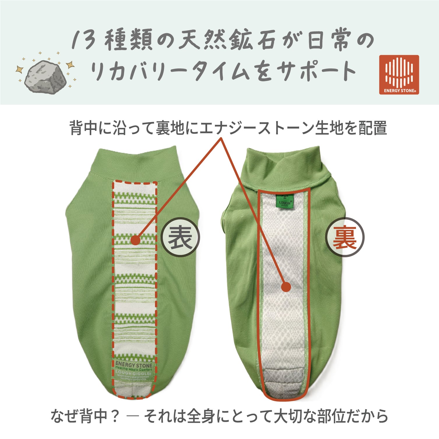 背骨に沿って裏側に配置された特殊生地には、鉱石由来のミネラル成分を練り込んだENERGY STONE®(エナジーストーン®)を採用。