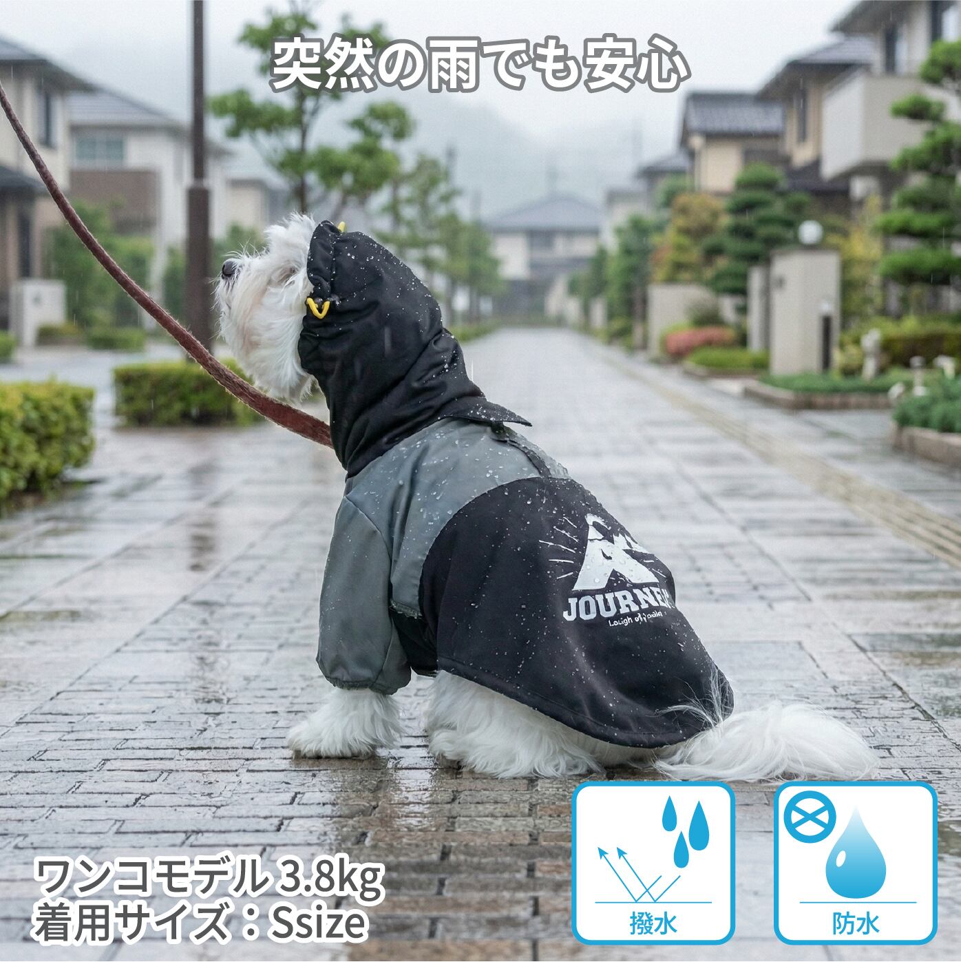 通常のお洋服としてお散歩やお出かけ用にデザインされていますが、突然の雨でもスヌードを被れば一時体にレインジャケットとしてご利用できます。