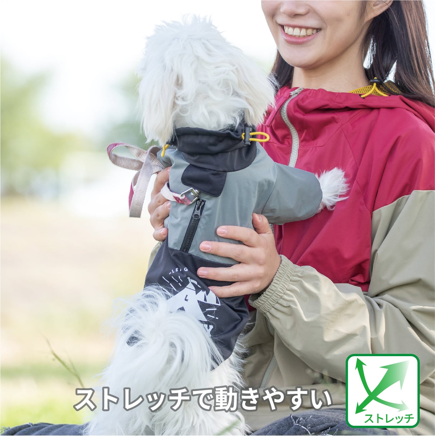 さらに、ストレッチ性のある素材を使用しているため、動きやすく、愛犬のお散歩やアクティブなシーンでもストレスなく着用できます。